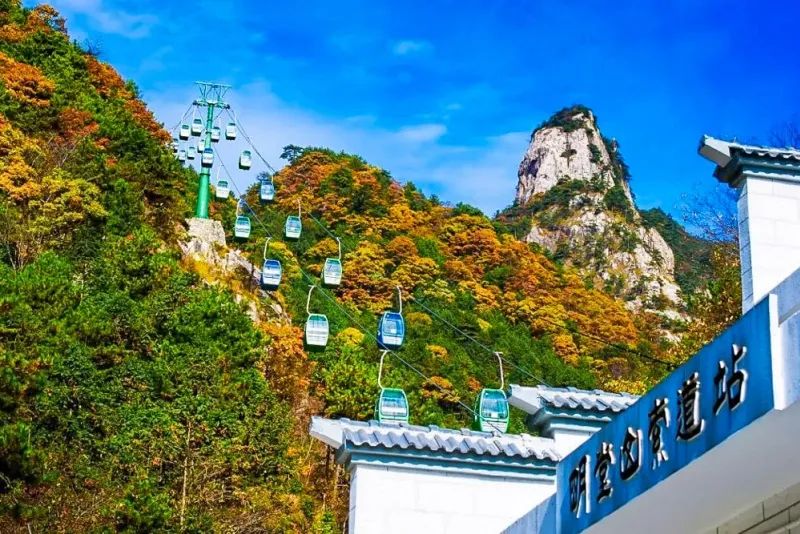 深秋的明堂山是看红叶的好时节。满山遍野的树木都开始变黄,颜色也缤纷了起来,红色黄色和绿色是主色调,仿佛穿上了彩妆,在山间勾勒出一幅绝美的油画。