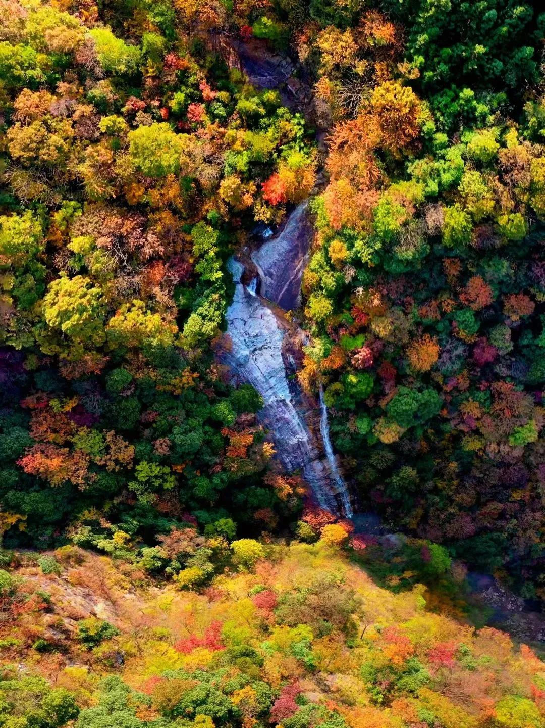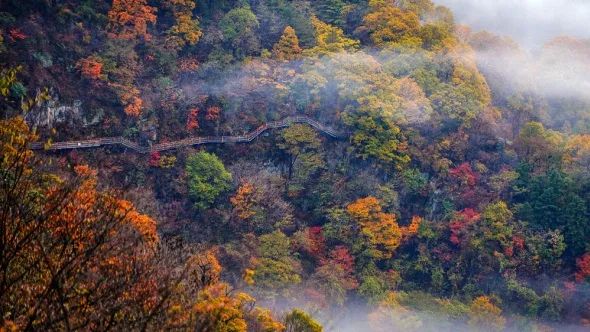 走过惊险的悬崖栈道,穿越在马鬃岭瀑布群之间,层林尽染,峰峦披金,云分七色,大自然把它装点的就像一幅画。