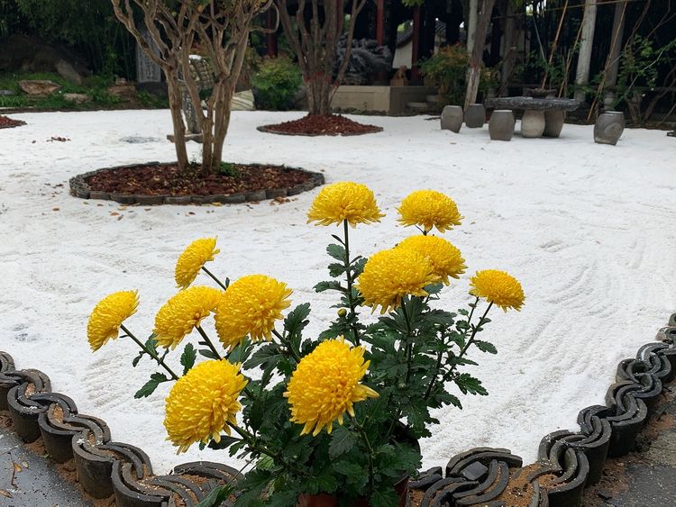 喜欢这里的枯山水景观,白色的细砂粒,点缀着黄色、粉紫色的菊花,对比很是鲜明。