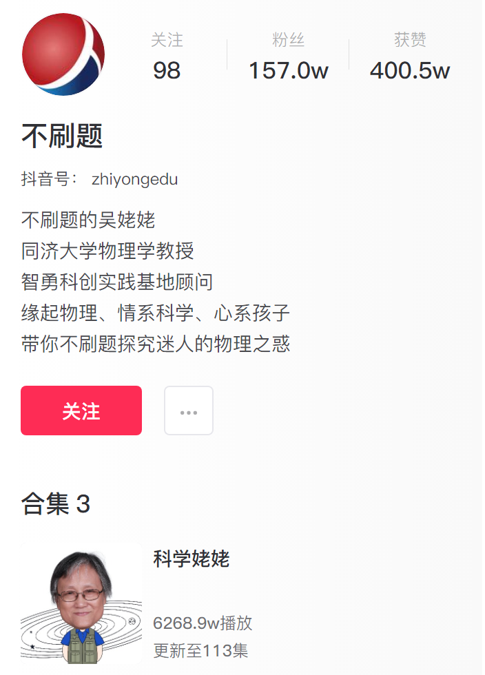 最近,72岁的同济大学物理学教授吴於人,凭着一系列硬核科普物理的短视频走红网络。镜头前的她,灰白短发,挂绳眼镜,渔夫马甲,一派利落质朴又不失帅气的科学家style,被150多万抖音粉丝亲切地称呼为“吴姥姥”。