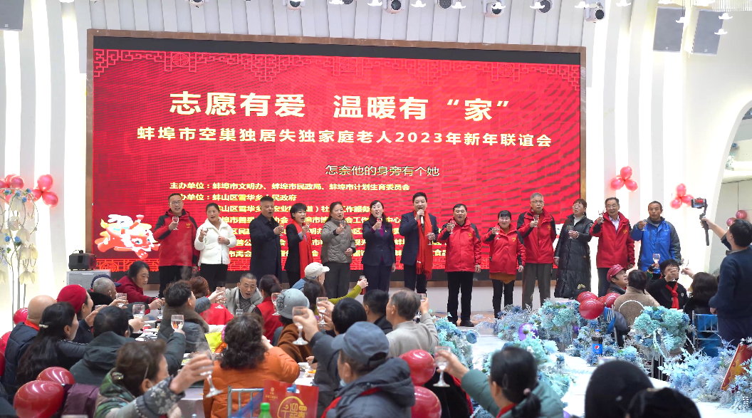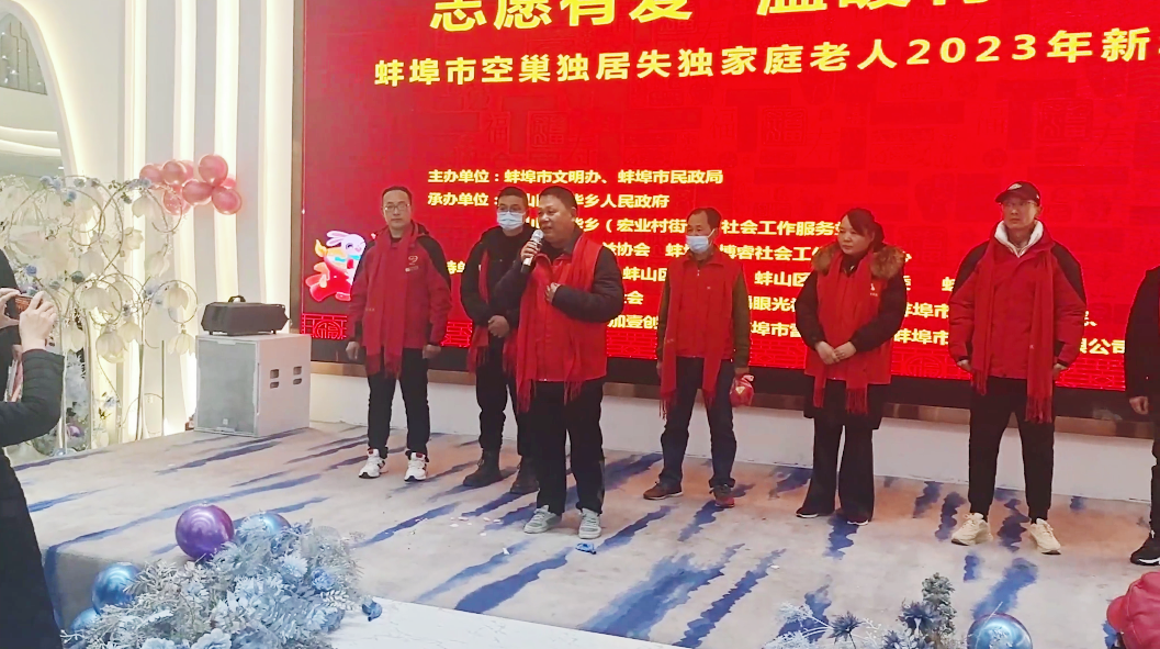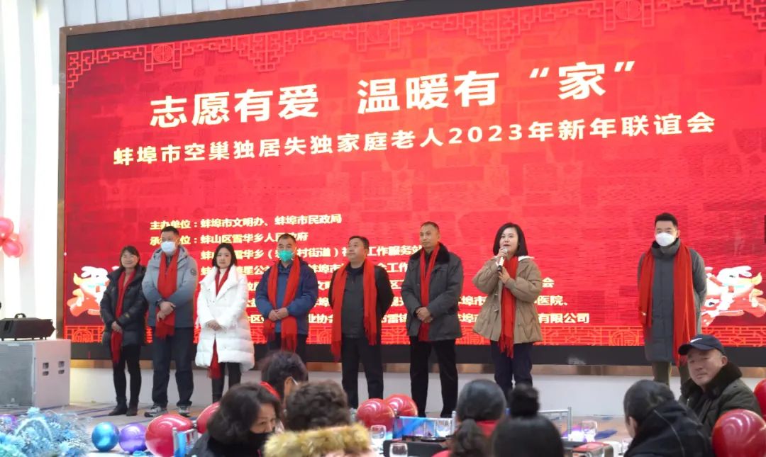 为了让空巢、独居、失独家庭老人大年三十不孤单,不孤独,不寂寞,开开心心过大年,2023年1月21日“志愿有爱,温暖有家”蚌埠市空巢、独居、失独家庭老人2023年新年联谊会在蚌埠市香百合轩豪国际大酒店圆满举行。此次活动由蚌埠市文明办、蚌埠市民政局、蚌埠市计生协主办,蚌山区雪华乡人民政府、蚌山区雪华乡(宏业村街道)社会工作服务站、蚌埠市善星公益协会、蚌埠市博睿社会工作服务中心承办。参加联谊会的领导有蚌埠市文明办志愿服务科科长田寿举,蚌埠市人大常委、市新联会会长胡堂前,蚌埠市民政局社会组织管理局局长殷月,蚌埠市民政局慈善社工科科长王佳,蚌埠市计生协秘书长张海陆,蚌山区民政局长钱玉,蚌山区卫健委副主任卢志国,雪华乡党(工)委委员、副乡长孔德林。