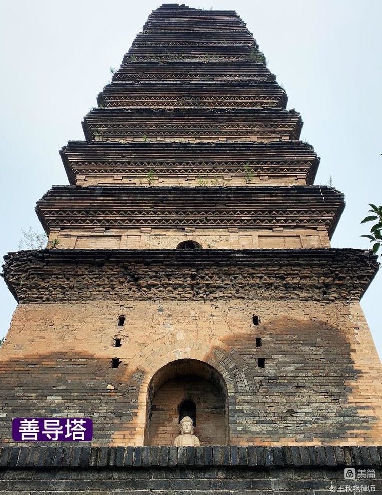 善导大师在681年圆寂后,其嫡传弟子怀恽将先师遗骨葬于神禾原上,为了纪念善导大师又修了佛塔。塔为十三级密檐式仿木结构实心砖塔,平面呈正方形,有高大的基座,每边长9.5米,塔的壁面上以砖砌出隐柱,隔为三个开间,并有假窗,手法细腻,和谐庄重。