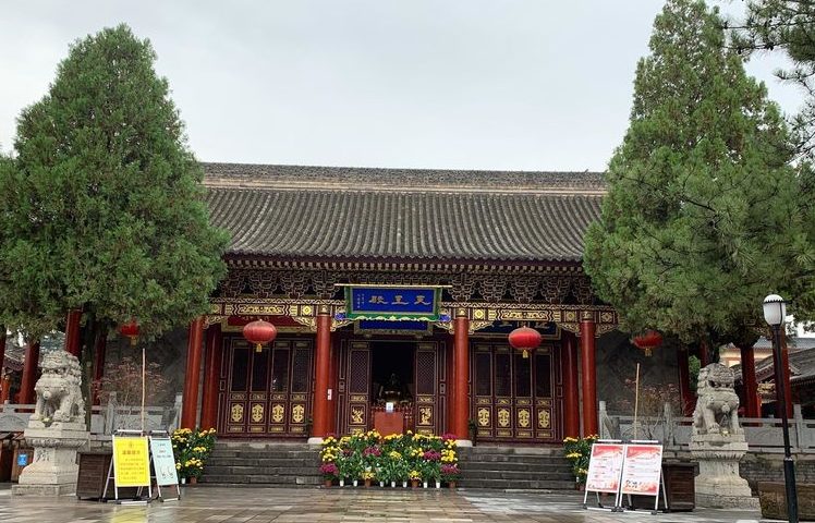 再往前走是天王殿供奉着笑看天下的弥勒,四大天王高大威猛肃立两侧,韦陀菩萨威风凛凛,守护着寺庙的安全。过天王殿后的院落两侧是碑廊。