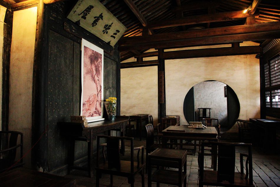 我终于见到了鲁迅笔下的三味书屋。一扇黑油的竹门,一间约30平米的屋,一张八仙桌,上悬“三味书屋”匾额,下挂着松鹿图。两侧为学生座位。这就是当时绍兴城内最负盛名的私墪。鲁迅在这里接受了五年的中国传统教育,除“四书五经”外,还读了许多古典文学及具有爱国思想和反抗精神野史、笔记和小说。鲁迅刻苦学习的精神受到先生的褒赞。