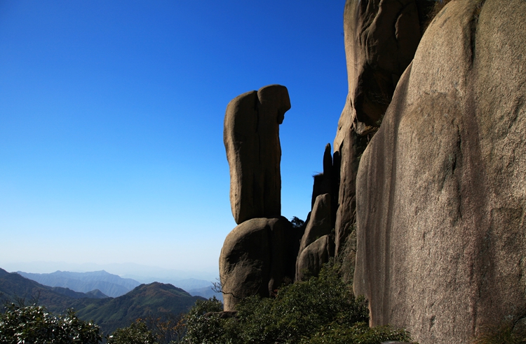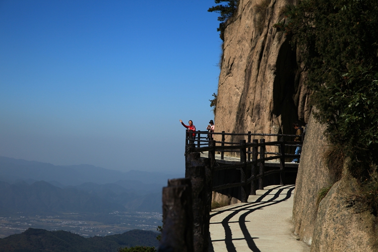 在天台游完,我们去往花台。天台与花台入口相距虽远,在山上却有山路相连。我们沿着山间栈道,一路的风光旖旎,说不尽的美景。在高高的山巅上有一块石头,像是天外飞来之物,这是花台上的平衡石。花台的栈道在山边隔空而立,有的地方狭窄,只能侧着身通过,每每经过这样的地方,我就胆颤心惊。按理说也不太陡,可能我害的是恐高症,故而怕之。我们走走停停,二个多小时终于爬上了海拔1299米的花台顶峰。