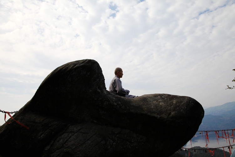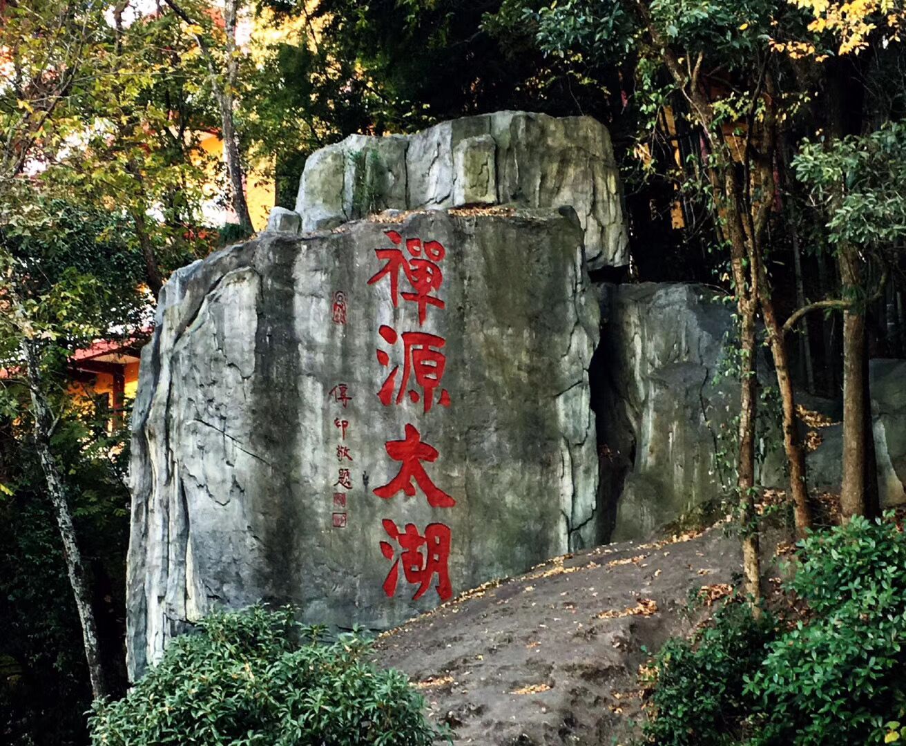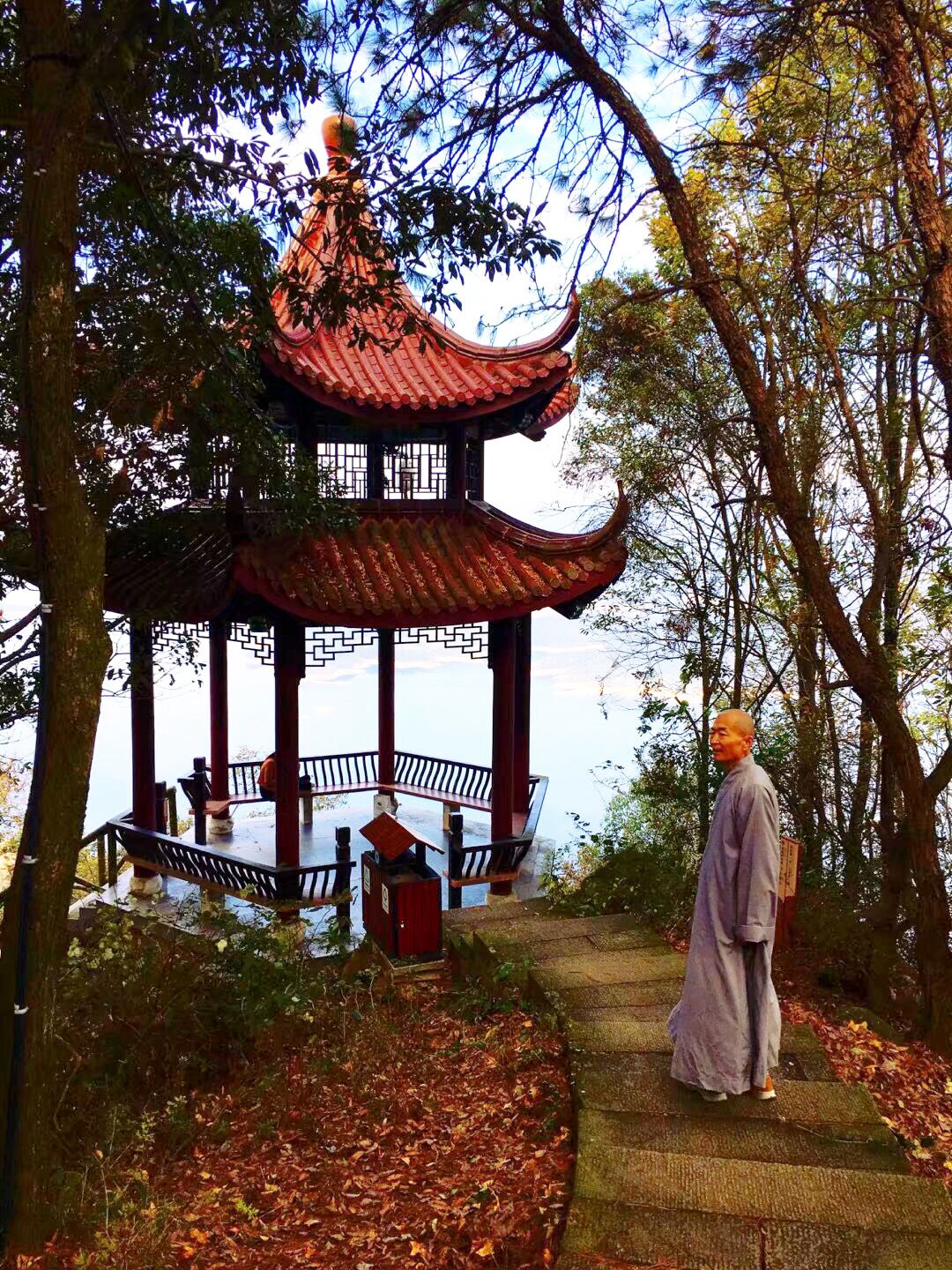 西风禅寺座落在凤凰山上,山下是著名的华亭湖。我们拾级而上,登上了凤凰山。站在山顶眺望,好一幅风光美景,只见碧水、蓝天,星罗棋布的小岛,穿棱的小船,逶迤苍翠的群山都尽收眼底,不愧是佛门净土,清幽、寂静让人俗念顿消。山上有块大石,师父介绍这是五祖打坐之石。我们爬上大石,沾沾法喜,感受一番非凡脱俗,清净无畏之气度。耳畔西风吹拂,让我想起了纳兰性德的“谁念西风独自凉,萧萧黄叶闭疏窗,沉思往事立残阳……”