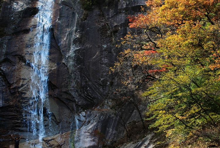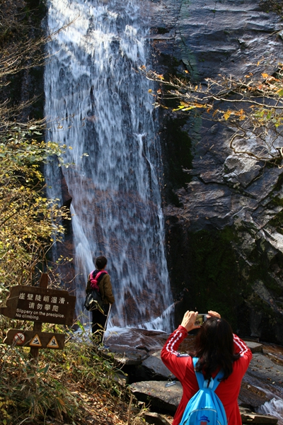 秋天来天堂寨的游客不多,整个峡谷除了流水声,显得格外寂静。我们边走边玩边拍照没有感觉到很累。行进中听到哗啦啦的流水声,转过几道弯既到了天堂寨的瀑布群。只见瀑布成串,溪水潺潺,潭池清澈,山清水秀,好一处清幽之地。往上走,一条接一条的瀑布挂山涧,最著名的瀑布是九影瀑”、“情人瀑”、“泻玉瀑”、“淑女瀑”、“银弓瀑”等。这些瀑布各有千秋,瀑水凌空而下注入下面深潭中,水流沿山势奔流而下,衬托着两侧山体的红叶显得更加清澈妩媚。