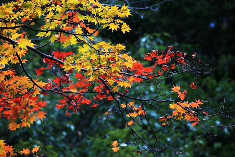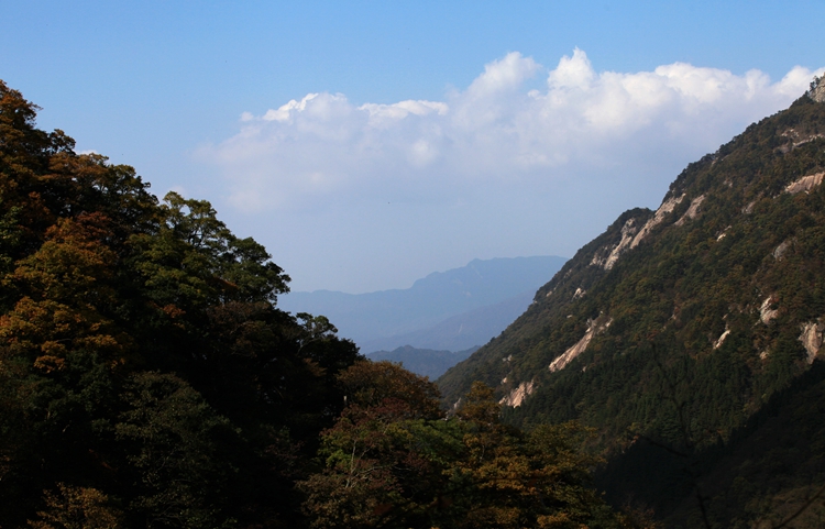 行在大别山峡谷,看崇山峻岭,茂林修竹,龙潭飞瀑,甚是惊艳,真不愧为“华东最后一片原始森林。”眺望山谷,灵雾飘渺,红叶如火,像点燃的野火染红了山谷。谷底溪水汩汩流淌,让人心旷神怡。一阵秋风拂过,红叶飘飞,如天女散花般飘落,溪水旁,栈道上都洒满了落叶,天地仿佛已连在了一起。我踩着枯叶,倾听脚下碎裂时细碎的“沙沙”声,感到说不出的惆怅,红叶在落地前的一瞬间,生命几乎没有了,我似乎听到了红叶心碎的声音,它终是摆脱不了命运的摧残,还是与树分离,飘零化泥。