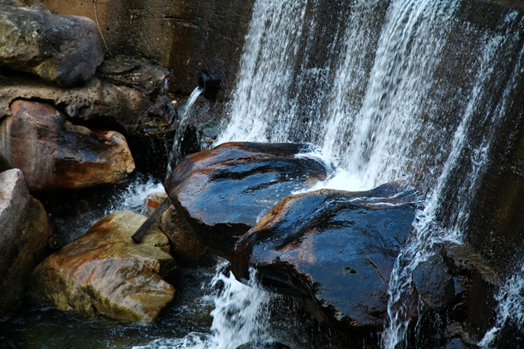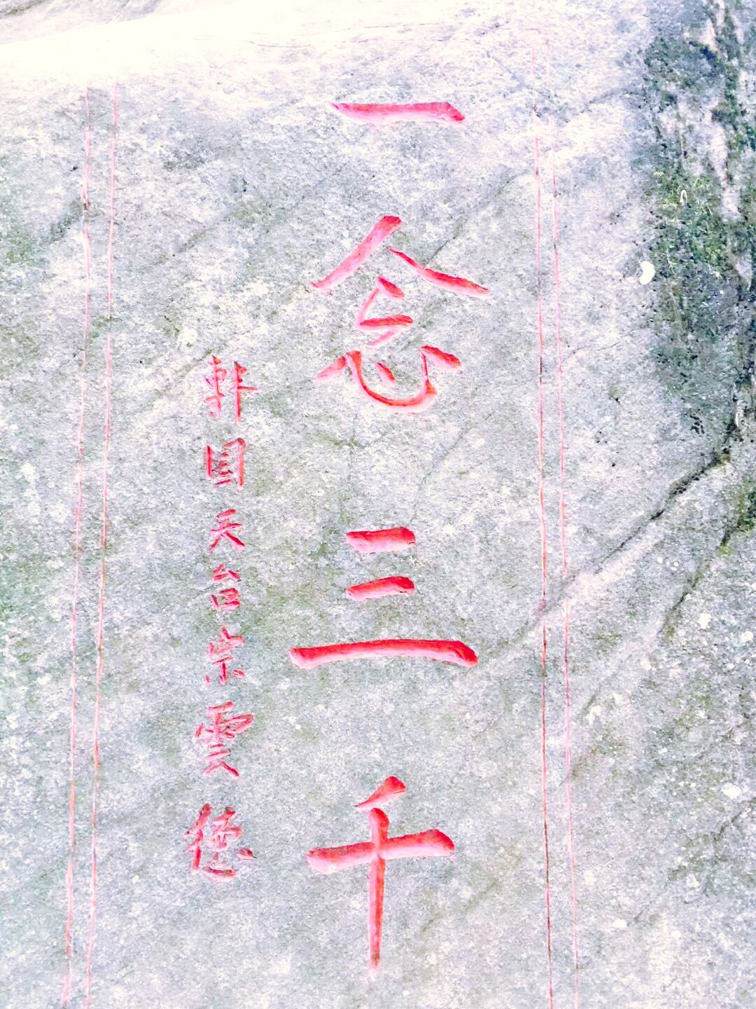 我们在峡谷行进的较慢,不知不觉已过午,当行到瑶池时遇到了分岔口,一条通往主峰,一条下山,我们不知到主峰还有多远?正巧有人从山上下来,问之,爬上主峰还需要3、4小时,我们算算时间,回程来不及了,遂放弃主峰。下山路途较顺,路旁大石刻有“路顺、气顺”等红色的大字,倒也符合我的心境。这是一条和上山完全不同的峡谷,没有飞瀑,只有溪流,我们看波澜起伏的山峰,看清澈的溪水,它们像是有生命一般。那山,那水,巍峨秀丽,让人迷醉。回到山下,天完全黑了。