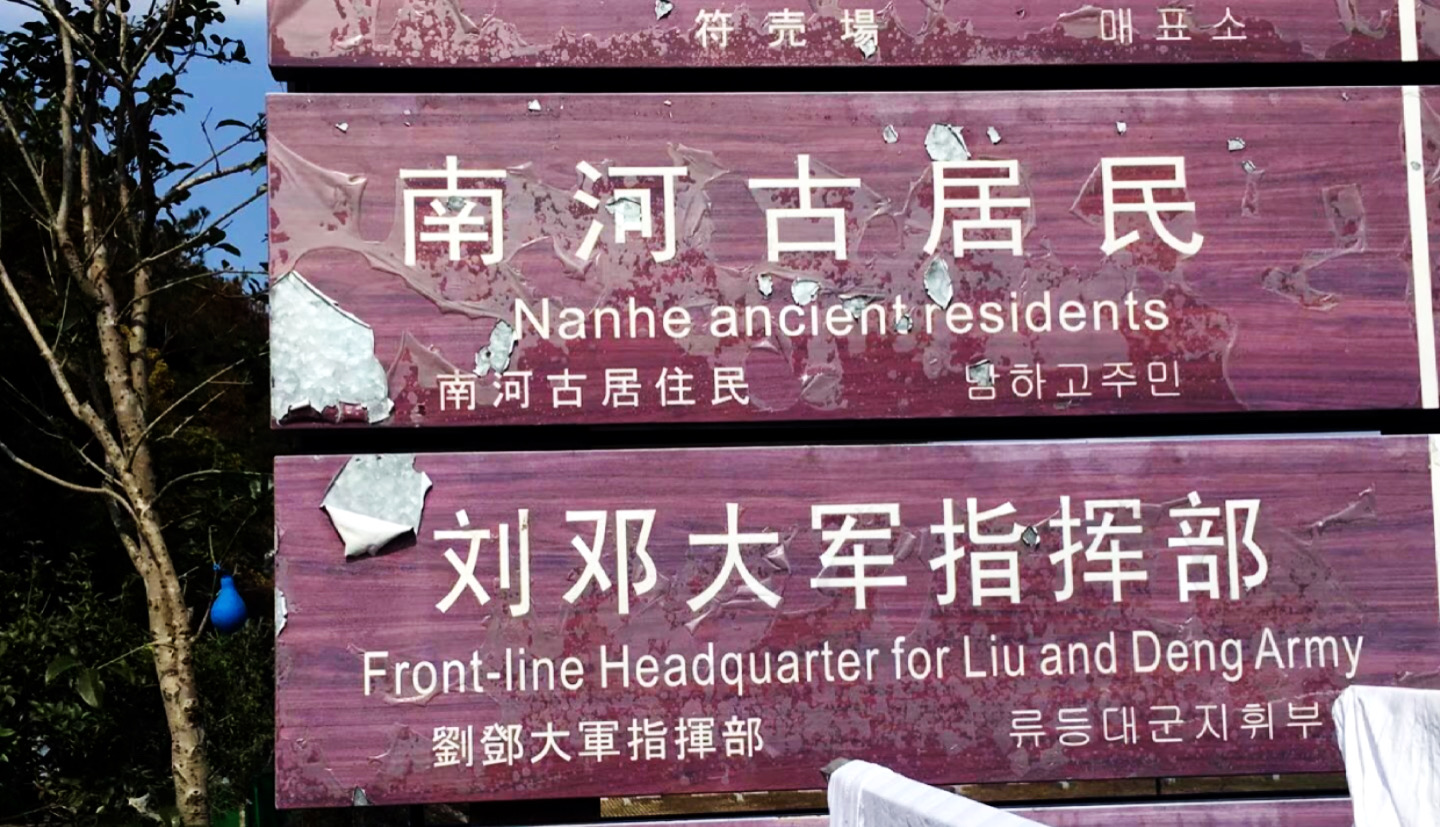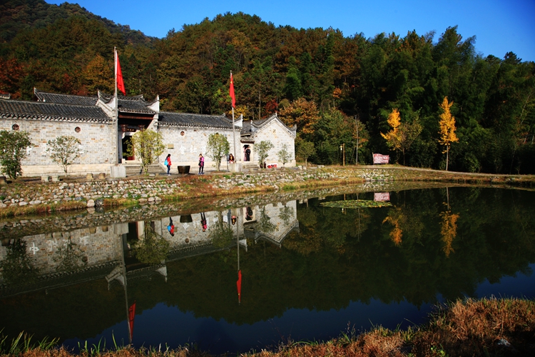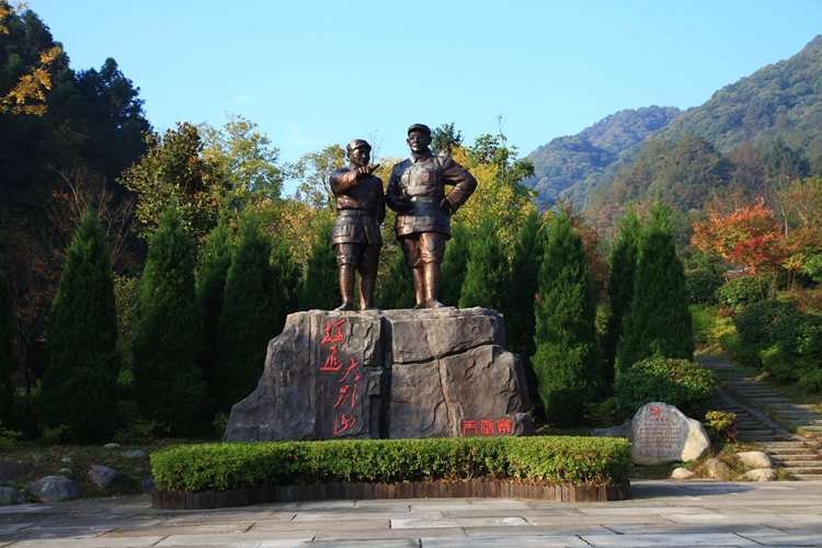 天堂寨除了秀丽的自然风光,山脚下还有一处耀眼的人文景观。这就是刘邓大军前方指挥部。当年刘邓大军挺进大别山,天堂寨重新回到了人民的怀抱,从此人民解放战争进入伟大的转折点。第二天,走进这座著名的景点参观,一溜的青砖瓦房,门前有一方池塘,粉墙黛瓦倒映池中,点缀着几棵黄叶树,景色优美。广场竖立着邓小平和刘伯承的巨幅铜像。指挥部里展现了一幅波澜壮阔的解放战争画卷,看史料图片介绍,让你有身临其境之感,并由衷感到革命的艰难和胜利的不易,让你顿生敬仰与感恩之情。