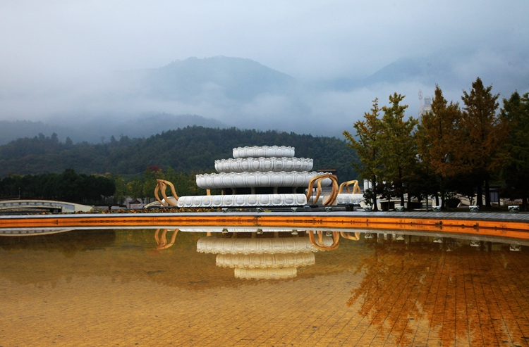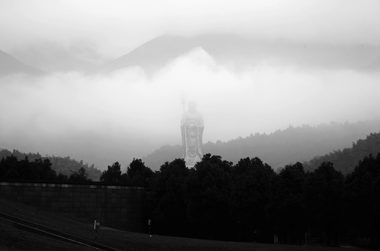 饭罢,老板送我们去九华山大愿文化园游玩。这处景点不要门票,只有里面的博物馆收票。这是一处新建的景点,里面静悄悄。此时天空正飘着小雨,园内云雾缭绕,天地间笼罩在白雾中,那氤氲的雾似一层乳白色的轻纱绕着山谷飘移,朦胧而迷离。眼前有一水池,池中有一座莲花型状的台子,后来我知道这台子就是莲花台,天气好时,后面的地藏菩萨铜像恰好矗立莲花台上面。天有簿云,山里便有雾气,地藏菩萨的铜像在雾气中若隐若现,大愿园流动着一派灵山佛国气象。真是太美了,它比画更有灵气,比诗更有诗意,我仿佛步入了仙境里。