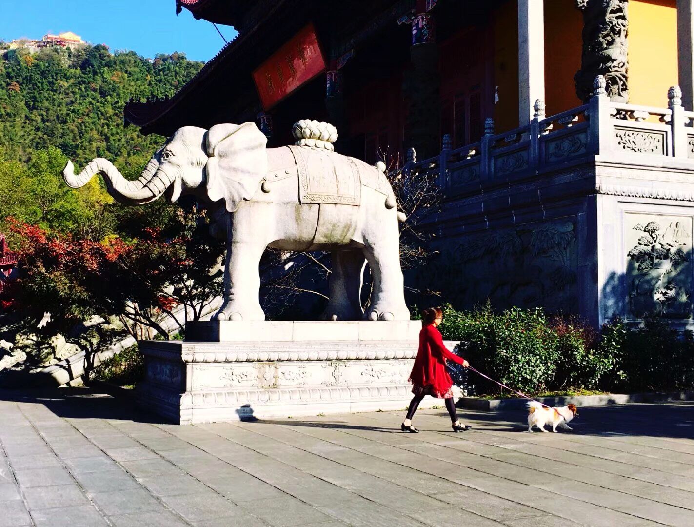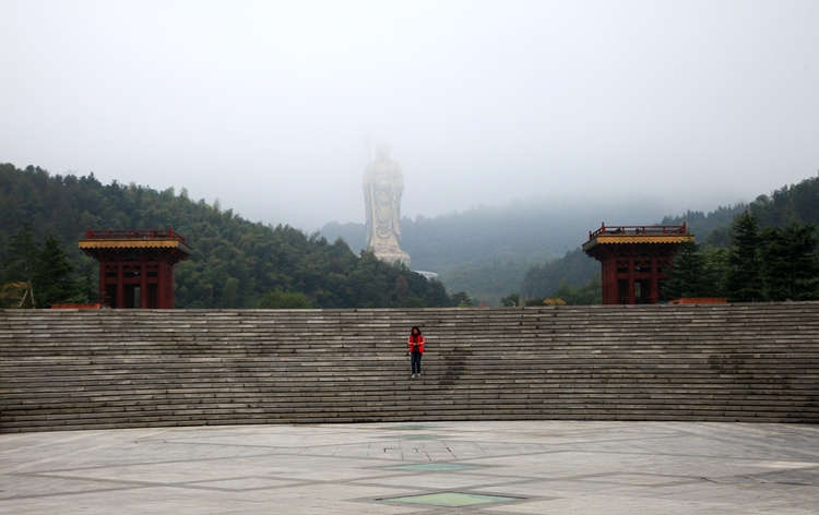 我们在山上淋了一会雨,就坐索道原路返回。为了躲雨,导游带大家进寺庙参观。当时进了几座寺庙我记不清了,只记得有肉身殿,大悲楼、放生池等。我也才知道了,高僧圆寂后可以肉身不腐,太让人惊奇了。大悲楼里传出袅袅清音,有人在诵经、拜佛,我站在门口看了许久。后来我打着伞站在大悲楼的石像前拍了一张照片。等我们回到船上,另一队人马也回来了,一个个都成了落汤鸡,我问同舱的大姐,看到黄山了?大姐说,别提了,山上雾大啥也看不见。