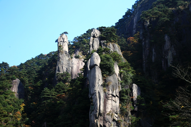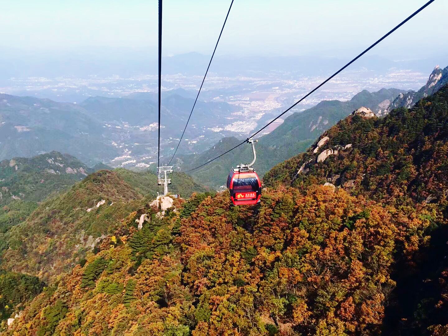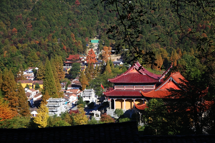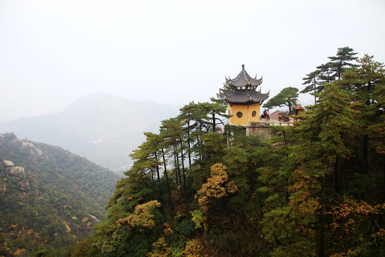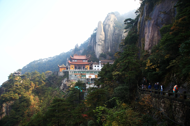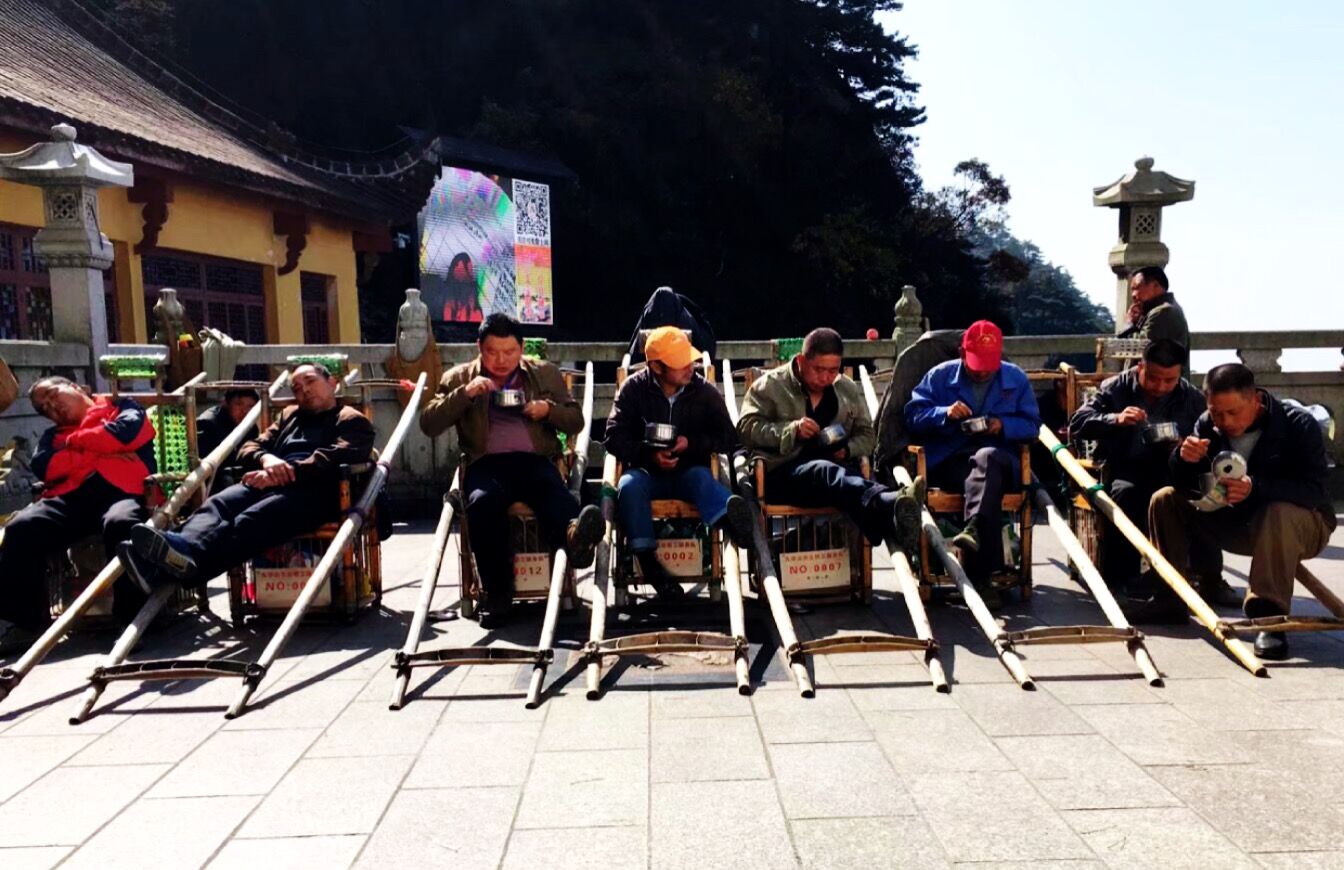 站在山顶俯瞰,九华全景尽收眼底,山下古刹林立,飞阁流丹,山上寺庙众多,香火鼎盛,还有奇峰怪石,云海,怪松让人叹为观止。丛林间苍松点缀着红叶,使景色更加秀美多骄。天台顶上还有一座寺庙,聚集了好多的游客,其中有一男士豪情万丈引吭高歌吸引了众人围观。天台顶上还坐着一拉溜的轿夫正在吃午饭,他们以此谋生,挣的是辛苦钱,每天抬着游客爬上爬下,汗流浃背,生活委实不易。我看了他们饭盒里的饭,生活还不错,有红烧肉,米饭,青菜等。