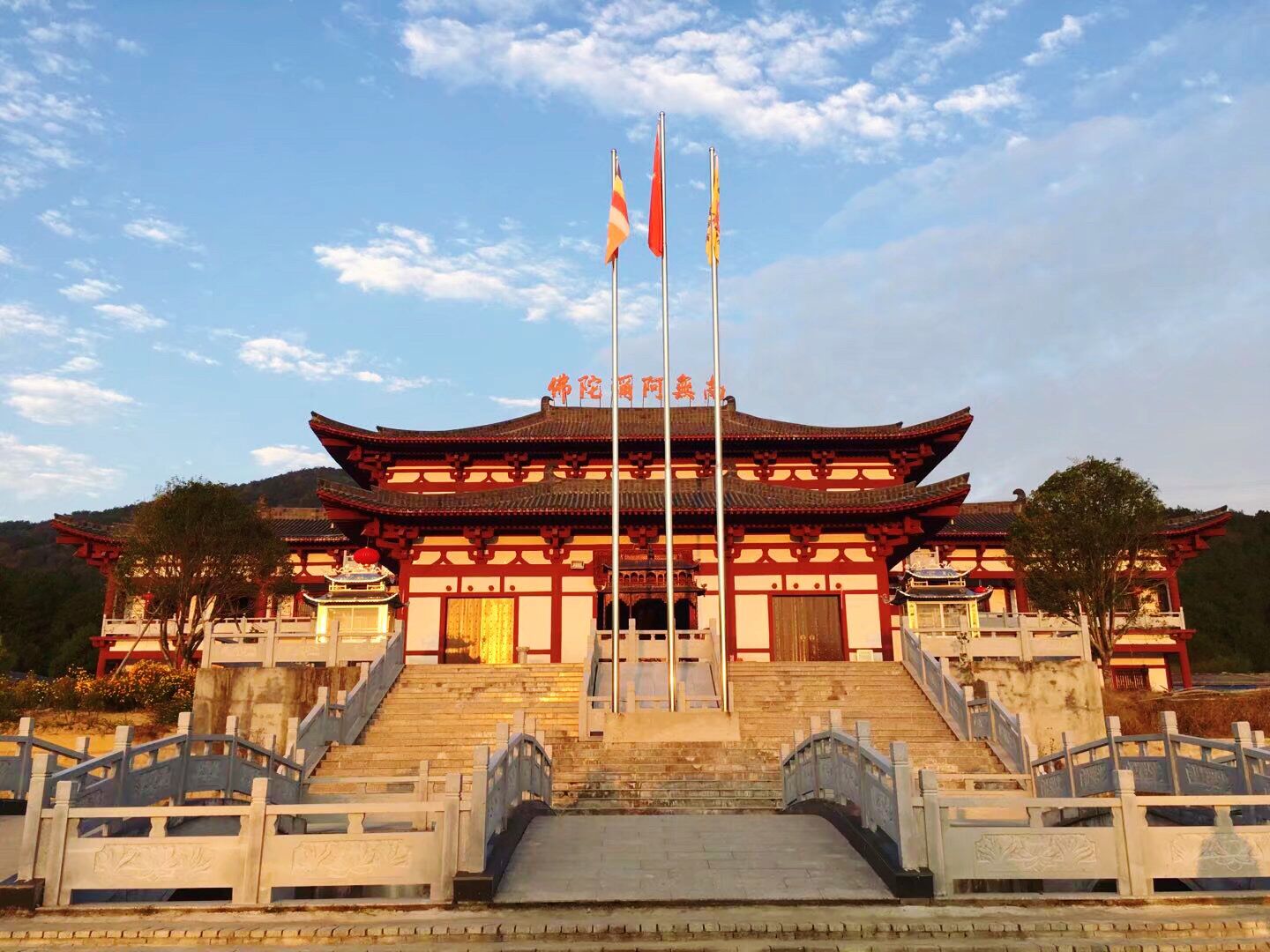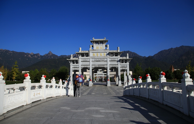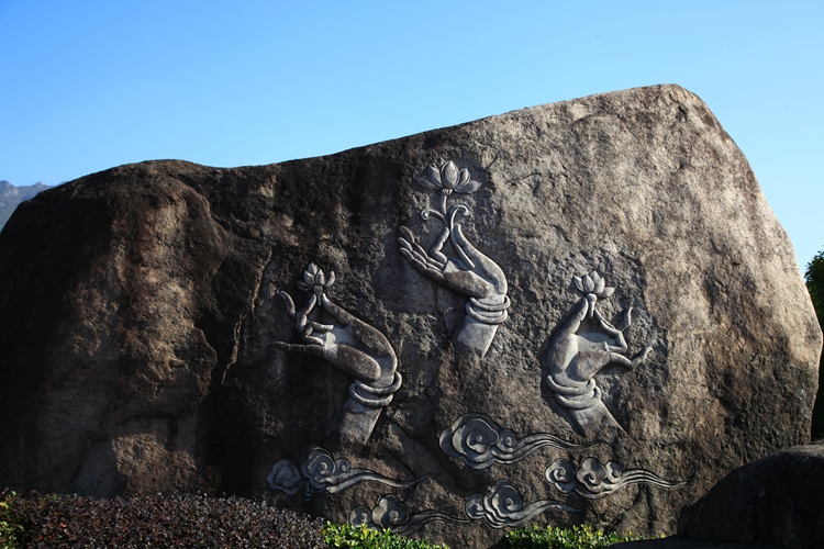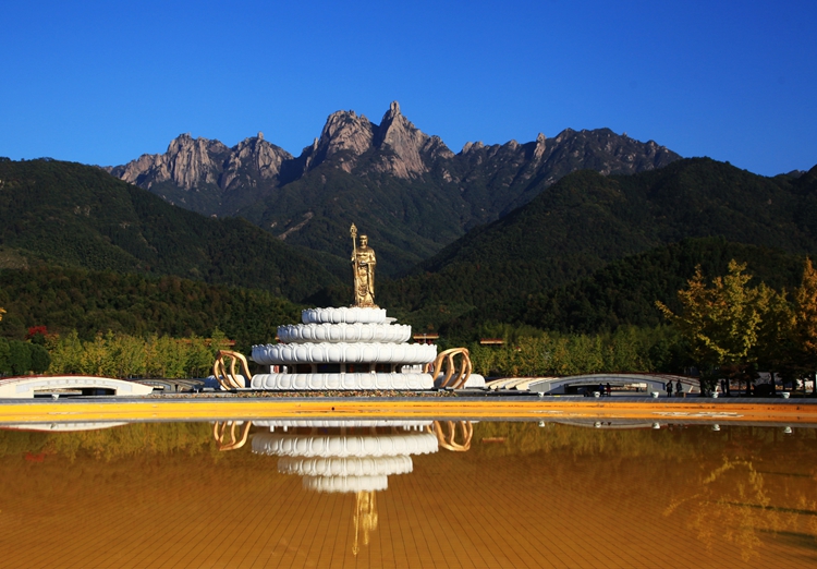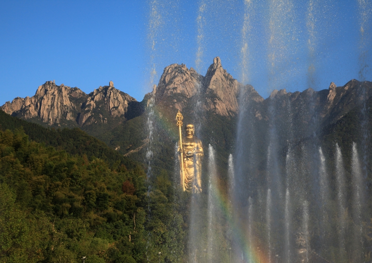 这天,经过一夜雨水的洗涤,天空湛蓝清纯没有一点杂质,我们慢慢走,细细欣赏。这座园林很大,以“圆通”为主题,紧扣地藏菩萨大愿、孝道、慈悲、救度等,通过建筑、雕塑、彩绘等艺术,充分展现了佛教文化的人文之美。我们走过莲花广场、五通桥、仿古牌坊,来到九子袈裟广场,看音乐喷泉水柱冲天,听梵钟馨音净化心灵,看白鸽飞翔自由自在,心里洋溢着无以言说的欢喜。