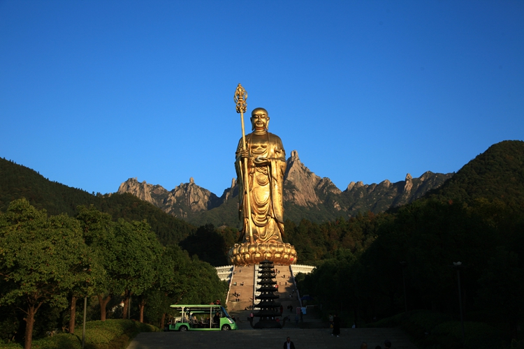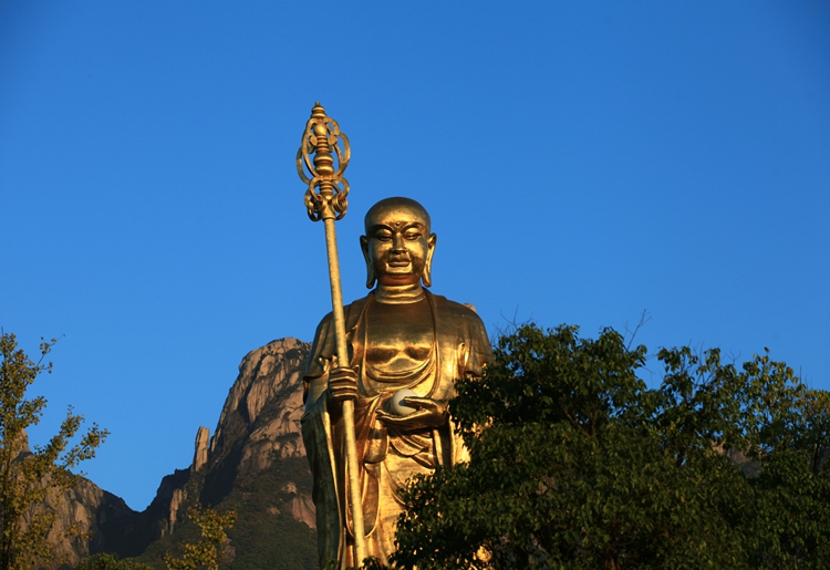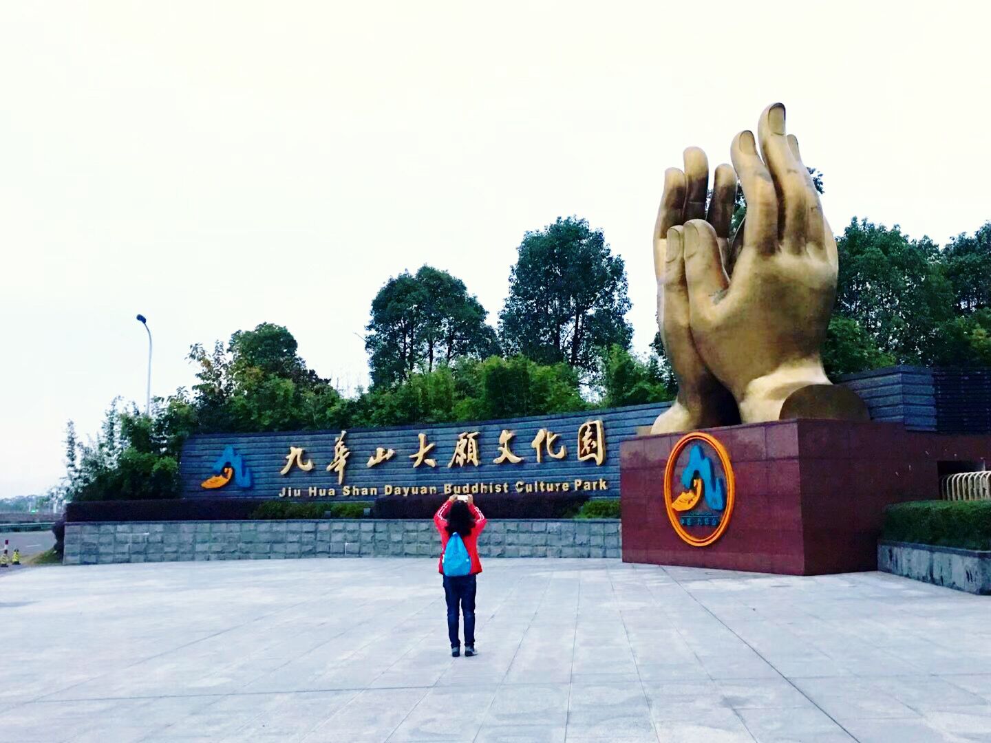 后来我们又来了一次大愿园,一直来到地藏菩萨的脚下。抬头仰望这尊99米高的铜像,地藏菩萨右手持锡仗,左手持摩尼宝珠,背靠青山,面向西北,端庄慈祥。听说打造这尊造像化费1.5亿元。我望着庄严殊胜的地藏菩萨,想起他抱着“我不入地狱,谁入地狱”的牺牲精神,发愿说;“地狱未空,誓不成佛”于是,千百年来,地藏菩萨分身无数,深入地狱,救拔众生。这就是地藏菩萨的伟大之处。