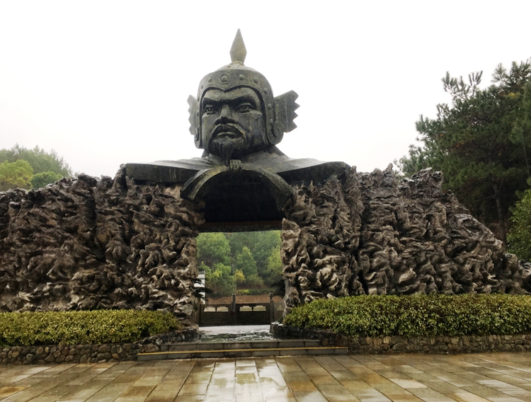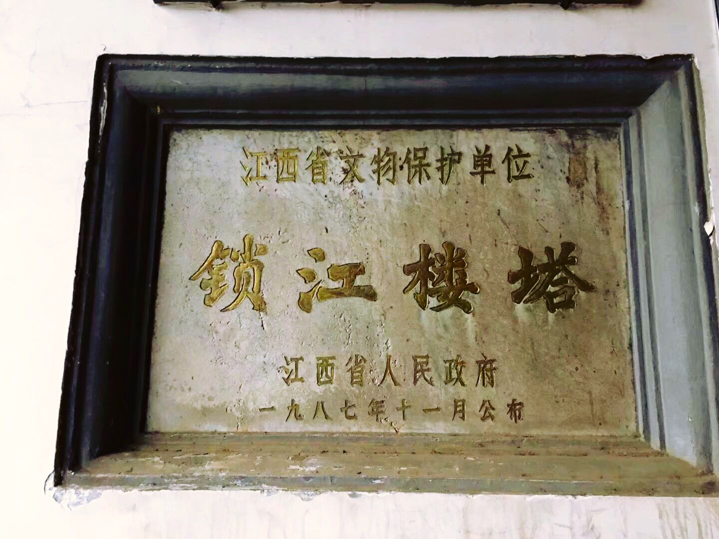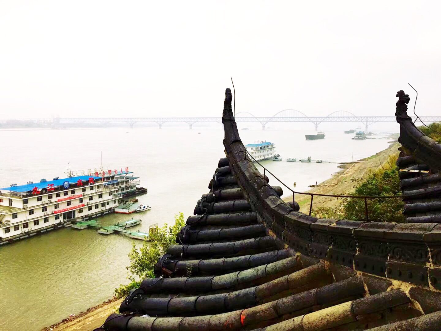 浔阳楼是一座三层建筑,飞檐翘角,古色古香。进的楼里,一层是梁山好汉齐聚忠义堂的群像,还有一幅瓷砖大壁画,描写的也是《水浒传》的场景。二层是篆刻、绘画还有宋江的一幅画像,厢房里陈列着宋江的反诗,旁边则是宋江的雕像,看他脸上的神情,似乎还沉浸在挥毫泼墨的万丈豪情中。三楼则是观景台还有供游客休息的桌椅等。一、二楼我匆匆而过,就到了三楼观景台,绕楼一圈,站在走廊上观赏,底下是滔滔长江水,远处烟雨蒙蒙。锁江楼和文峰塔近在眼前。