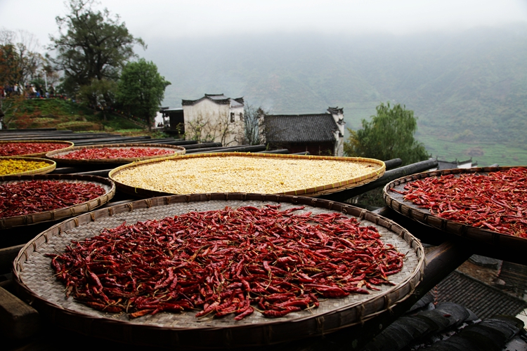 由于下雨的缘故,农家没晒秋,粉墙黛瓦光秃秃,这让我们甚感遗憾。当登上篁岭村的最高处,这是拍片的最佳地点,房间角落里里堆着几个大萝筐,不甘心的我们不顾农家的反对,硬拉出萝筐放到房顶上,摆拍了几张照片,算是弥补了晒秋的遗憾。可惜萝筐里的东西太少,只有红辣椒、玉米粒、小黄菊。如果是好天气,摆上五彩缤纷的农作物,构成绚烂的晒秋景观,一定会拍出美片的。叹只叹,我们运气差,遇到了雨天。也罢,既来之则安之,看不成秋,那就逛古村吧。