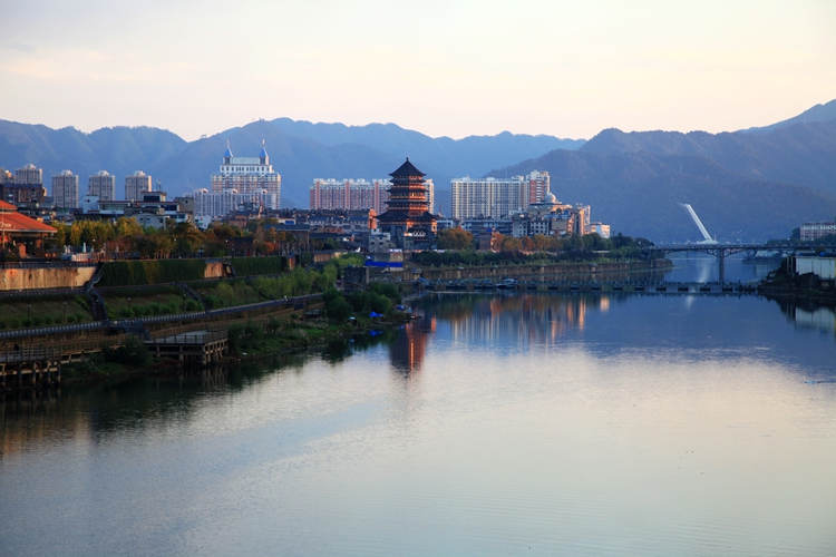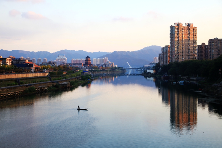 我觉得景德镇不仅陶瓷大放异彩,她的自然风光也秀美。我们每天穿行城中,总是路过一座大桥,桥下是一条大河,两岸风光旖旎,宝塔倒影水中,小船悠悠,一幅静美恬淡的画卷。有天下午,我们又从桥上通过,遂决定下桥观景。站在桥上眺望,夕照下,河水波光遴遴,古塔和大楼遥遥相望,河中小舟轻轻的摇着,我仿佛置身一幅山水墨画中。这条河叫昌河,是景德镇的母亲河,有诗云:三面青山一面水,一城瓷器半城窑,恰如其分说出了景德镇的风貌。