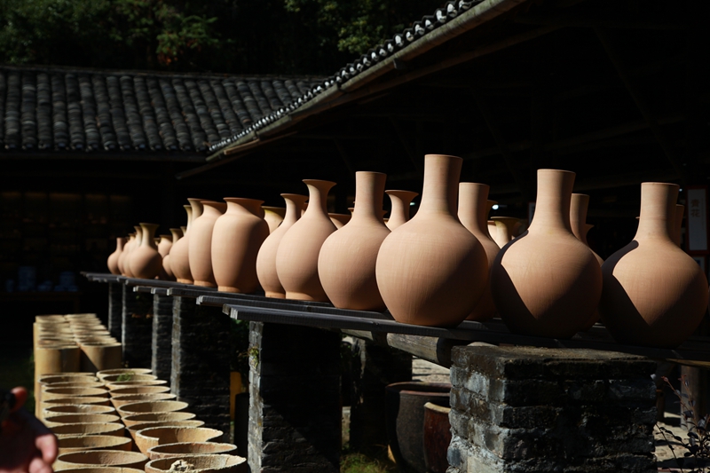 当我们穿过瓷碑长廊,来了手工制瓷坊前停下了脚步,那些加工好的泥料,或成品或半成品,白如玉,明如镜,薄如纸,声如罄,摆在货架上,堆在地上,在蓝天的映照下,美仑美奂。作坊里有几个工人师傅正在操作,一块块的泥巴在他们手中变成了一件件精美的艺术品,看的我们入了迷。可别小瞧这些人,随便拉出一位都是国家级的艺术大师。泥巴在他们的手里赋予了美感,从泥土里绽放出生命。