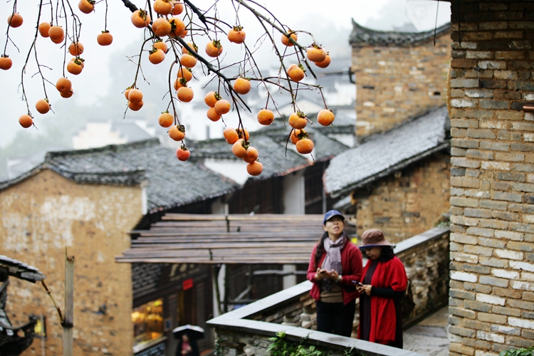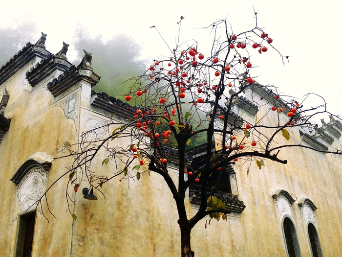 下了缆车,沿着山坡道进村。此是,雨下的甚急,踩着落叶拾级而上,既见一座古牌坊矗立在村头。边上有棵大树,几缕黄叶点缀,牌坊上写着篁岭两字。行不远又见一棵香樟树,高大挺拔,古意盎然(香樟树叶子未黄)。再往前走就到了村子里。此时,秋雨绵绵的篁岭秋意正浓,田野里枫树红艳艳,枝头柿子沉甸甸,听说这柿子是网红树,围了好多人在拍照。树上的柿子金灿灿,仿佛向我们说着“柿柿如意。”