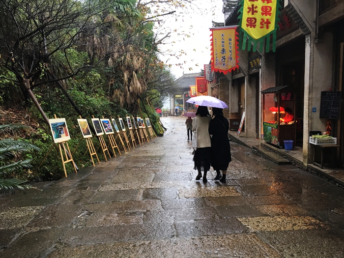 我们很晚才进的江湾,原因是路途中见到一座养花基地,里面的多肉植物吸引了目光,遂下车观赏。细雨密布下的江湾还是那个江湾,粉墙墨瓦还是旧时模样,铁打的村庄,流水的过客。匆匆而来,又匆匆而去,唯有当地人固守着自己的家园。旧地重游,已没有了当初的新鲜感,走在湿漉漉的石板路上,感受古镇雨天的朦胧,别有一番韵味。是夜,躺在旅店里听雨,淅淅沥沥难以入眠。