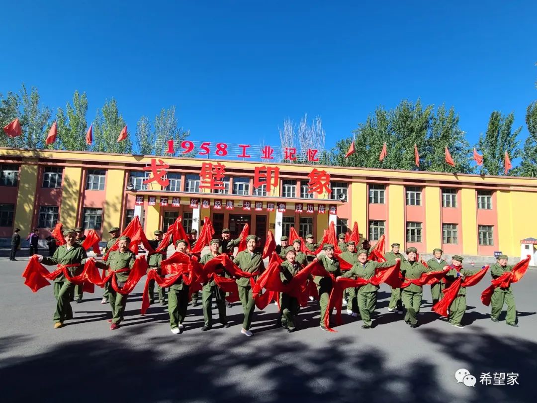 石河子1958戈壁印象文旅基地是一个位于新疆石河子市的旅游景点,以展示和再现1958年兵团工业的起源和发展历程为主题。该旅游基地是在原八一棉纺厂厂区内建成的,园区内有雕塑群和纺织博物馆等展示设施、厂房、食堂等建筑物,而这些建筑物的大门上均挂有1958这个时间点,以此为游客呈现出一个鲜明的时代印记。在这个旅游基地,特扶家庭成员们可以感受那个时代的峥嵘岁月,也可以通过各种方式了解兵团工业的发展历程。同时,还可以参观、参加体验各种展览和活动,例如老八棉办公楼门口跳起年轻时的舞蹈,或者穿着军装朗诵《年轻的城》并合影留念等活动。