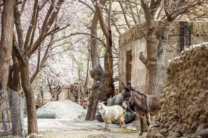 百年野杏树遮天蔽日,云霞般花朵傲然怒放,塔吉克族妇女在杏花树下悠闲地做着绣品、孩子在嬉戏……宛如世外桃源。