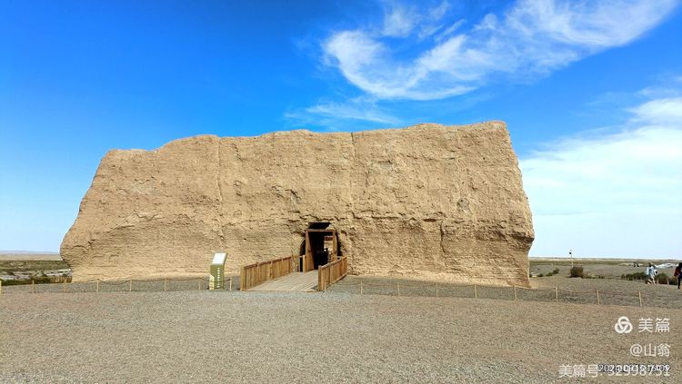 (图片:小方盘城原为都尉之住所,饱经沧桑,略显轮廓。西汉为玉门都尉府治所,东汉为玉门候官治所,距今敦煌市区约90公里。现存障一座,关址城垣完整,黄土版筑,略呈方形,夯土版筑,约26 米见方,高约 10米,面积约700 平方米。西、北面各开一门,形如土洞,城上方四周有宽13米的走道,城内东南角有一条宽不足1米的步道,靠东墙向南转上可直达顶部。障外有坞院,障南残存的东西向坞墙清晰可辨,障北有一风蚀台地,上有烽燧遗迹。千年雄关,见证了敦煌华戎交汇的繁荣昌盛,同时,由于特殊的地理、气候条件,小方盘城也是我国现存最完好的汉代土遗址之一。)