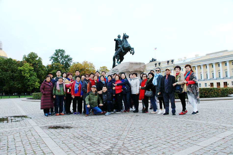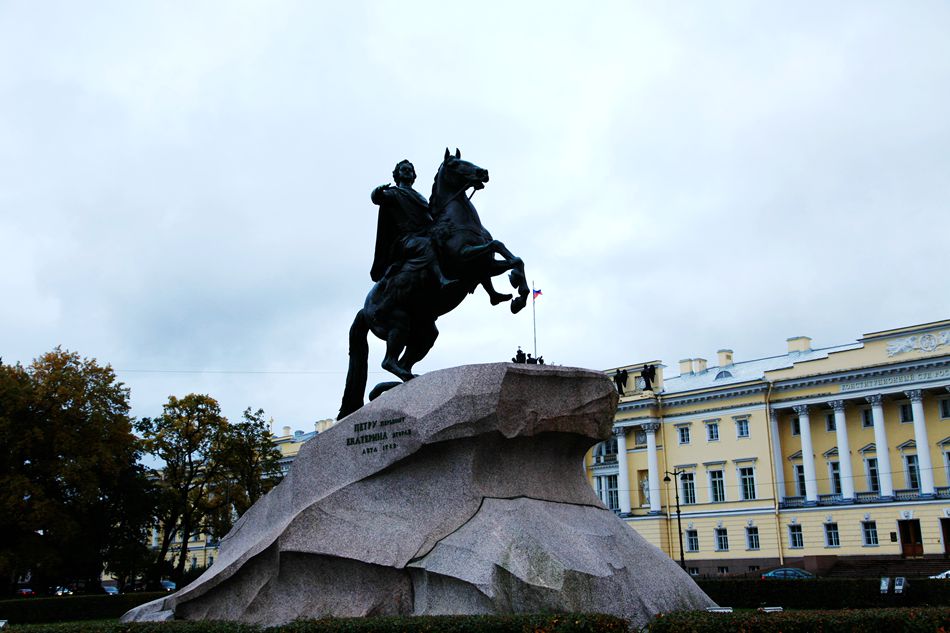 广场中央竖立着一座青铜骑士雕塑,这是彼得大帝的纪念碑。我仔细观察,花岗石上,骏马前腿腾空,彼得大帝安坐在骑上,两眼炯炯有神,目视前方。这座雕像高大雄伟,栩栩如生,把彼得大帝这个新都缔结者、改革者、立法者无坚不摧的意志力表现的淋漓尽致。听导游介绍,这座雕塑是因普希金的长诗《青铜骑士》而声名远扬。诗人说:“高傲的骏马,你奔向何方?你将在哪里停蹄?啊!威武强悍的命运之王,你就如此在深渊之底,在高峰之巅,用铁索激起俄罗斯腾跃向上。”