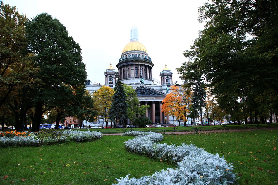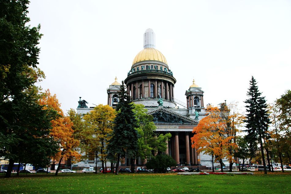 在青铜雕塑的后面有一座大教堂,这座教堂叫伊萨克教堂。暮秋时节,教堂前面有二棵金灿灿的大树映衬着教堂非常漂亮。导游介绍,伊萨基辅大教堂是俄罗斯北方非常大的教堂,整座建筑造型雄浑壮观,被视察为俄罗斯晚期古典主义建筑的杰出作品,是世界四大教堂之一。可惜我们没入内参观。