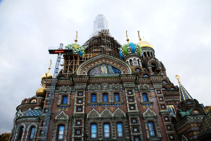 在圣彼德堡还有一座著名的滴血大教堂,光听名字就够血腥的了。确实,这个地方是亚历山二世皇帝在此遇刺身亡,为了纪念他而修建的。导游讲了这个悲惨的故事,让人嘘唏不已。滴血大教堂是一座纯俄罗斯风格的建筑,极其奢华美丽。装饰的花花绿绿,镶嵌有复杂、颜色艳丽的影像图案,用丰富的彩色图案瓷砖、搪瓷青铜板装饰,教堂顶部还立着五光十色的洋葱头顶。