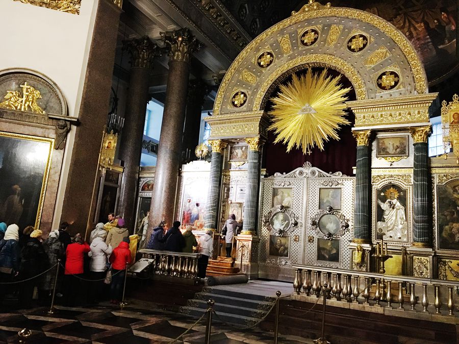这座教堂宏伟壮观、气势磅礴。进入教堂,看着高高的穹顶和摇曳的烛光,感觉异常平静和温暖。里面正在举行祈祷仪式。俄罗斯人有秩序的排着队,肃穆庄严唱着祈祷歌。歌罢,一个穿黑衣的神父叽哩咕噜不知讲的什么。据说这座教堂是凯瑟琳二世之子保罗一世举行婚礼的教堂。我们在里面静默站立了五分钟。