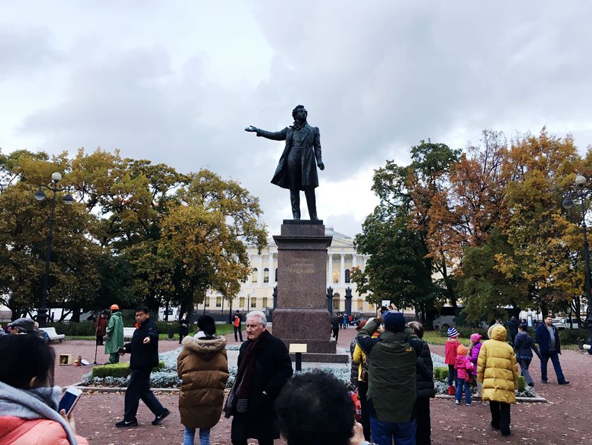 普希金是俄罗斯著名的文学家、诗人、小说家,现代俄国文学创始人。他的许多经典诗词我都读过,是我最崇拜的俄罗斯文学大师。圣彼得堡则是普希金最后生活过的地方。这里到处都有诗人的足迹。有普希金公园、博物馆、故居纪念馆,雕像等。听导游讲解,还知道了诗人鲜为人知的身世。原来普希金不是纯正的俄罗斯人,他的外貌和纯种俄罗斯人是有区别的。他的祖先是黑人,深得彼得大帝的喜爱,把他收为教子,培养成亲信。黑人的曾孙就是普希金。
