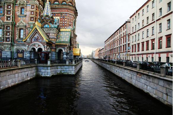 我围着教堂转了360度的圈,可是教堂离的实在太近,不好取景,空中又有乱七八糟的电线,拍的照片也不好看。教堂跟前有许多小贩,有给人画像的画师,有打扮成古装的俄罗斯男女模特。教堂靠近一条窄窄的河,河水波光粼粼,有游船从桥下驶过。景色旖旎,风光秀美,无法想象这里曾是历史悲剧之地。(待续)