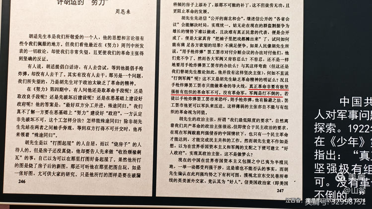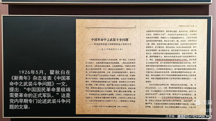 (图片:八一纪念馆展厅墙面展示:1926年5月瞿秋白发表文章指出“中国革命里极端需要革命的正式军队”)