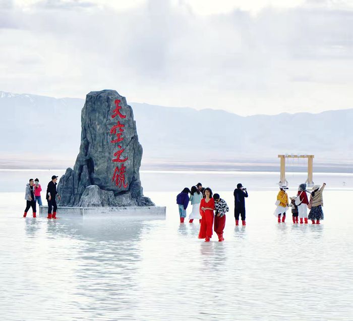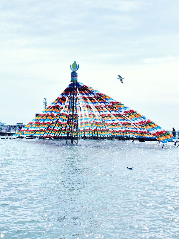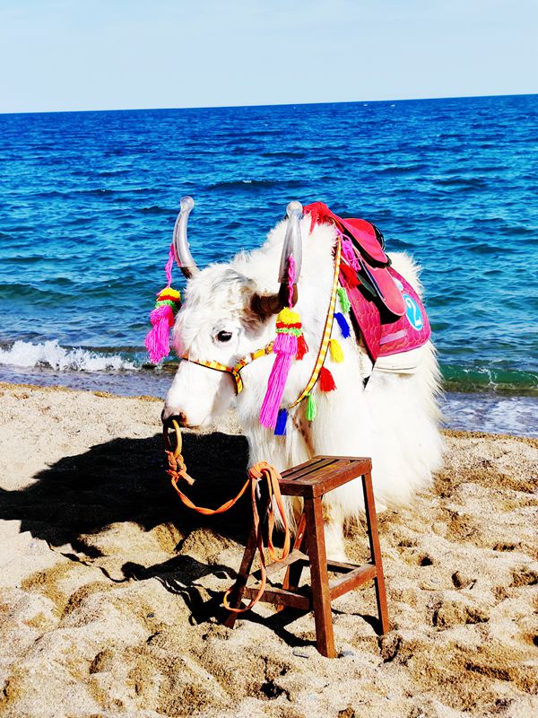 导游解散了队伍,规定了集合时间。我与妹妹沿着湖畔走向二郎剑景区。湖边有许多海鸥在空中盘旋,时而俯冲下来啄食游客抛出的面包屑,它们洁白的羽毛在阳光下闪闪发亮,与湛蓝的湖水形成了鲜明对比。牦牛打扮的花枝招展像花姑娘一般,驼着游客在湖边拍照。还有五彩经幡点缀在岸边,彩条飘飘猎猎作响。阳光在水面跳跃,闪烁着金色的光芒,雪山倒映在湖中,形成了一幅天然画卷。