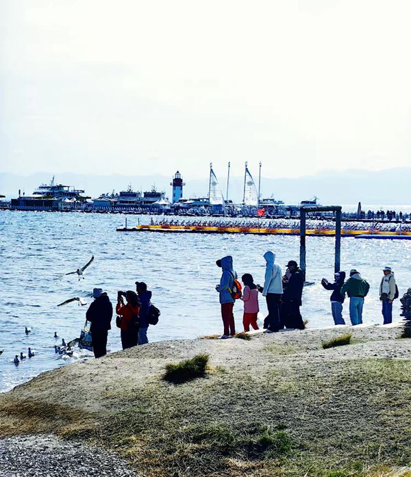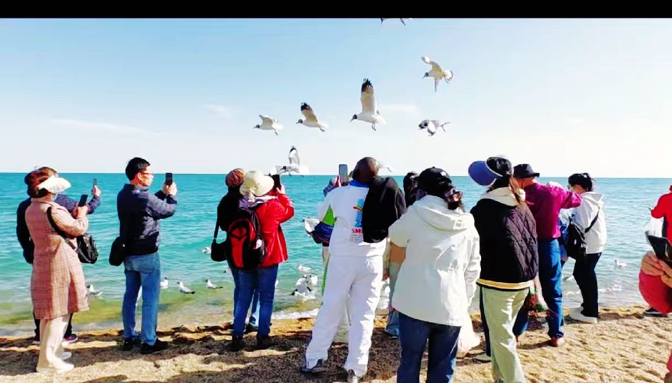 中午十分,阳光变得炽热起来,但气温依然不高。徜徉湖边,寒风还是刮脸。我们坐在湖边的长椅上休息,看着来来往往的游客。有拍照的小情侣,有嬉戏的孩子,有成群结队的游客,还有像我们一样的老年人。总之,每个人都在用自己的方式感受着青海湖的魅力。不知不觉间,集合的时间到了,我们依依不舍离开青海湖。