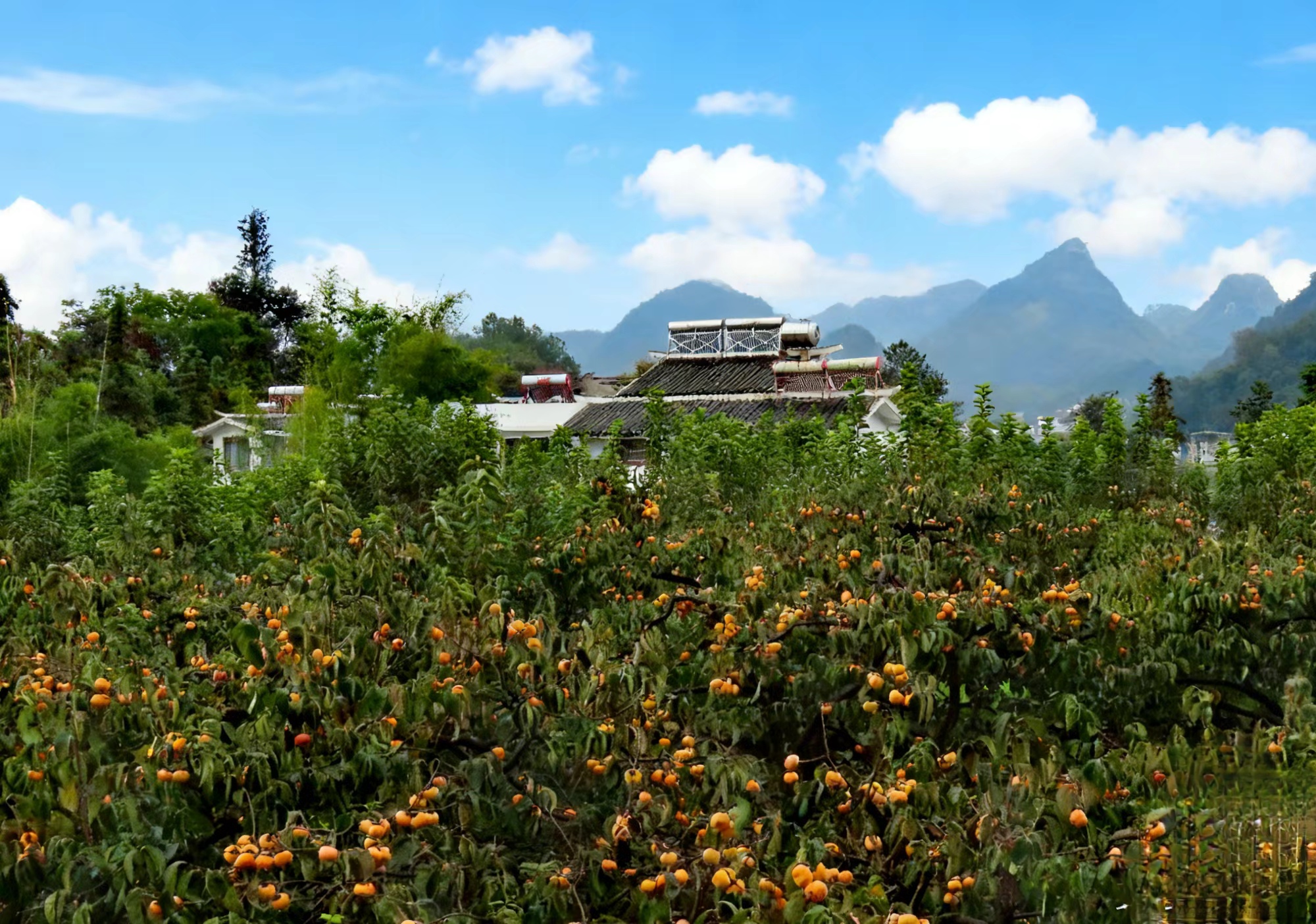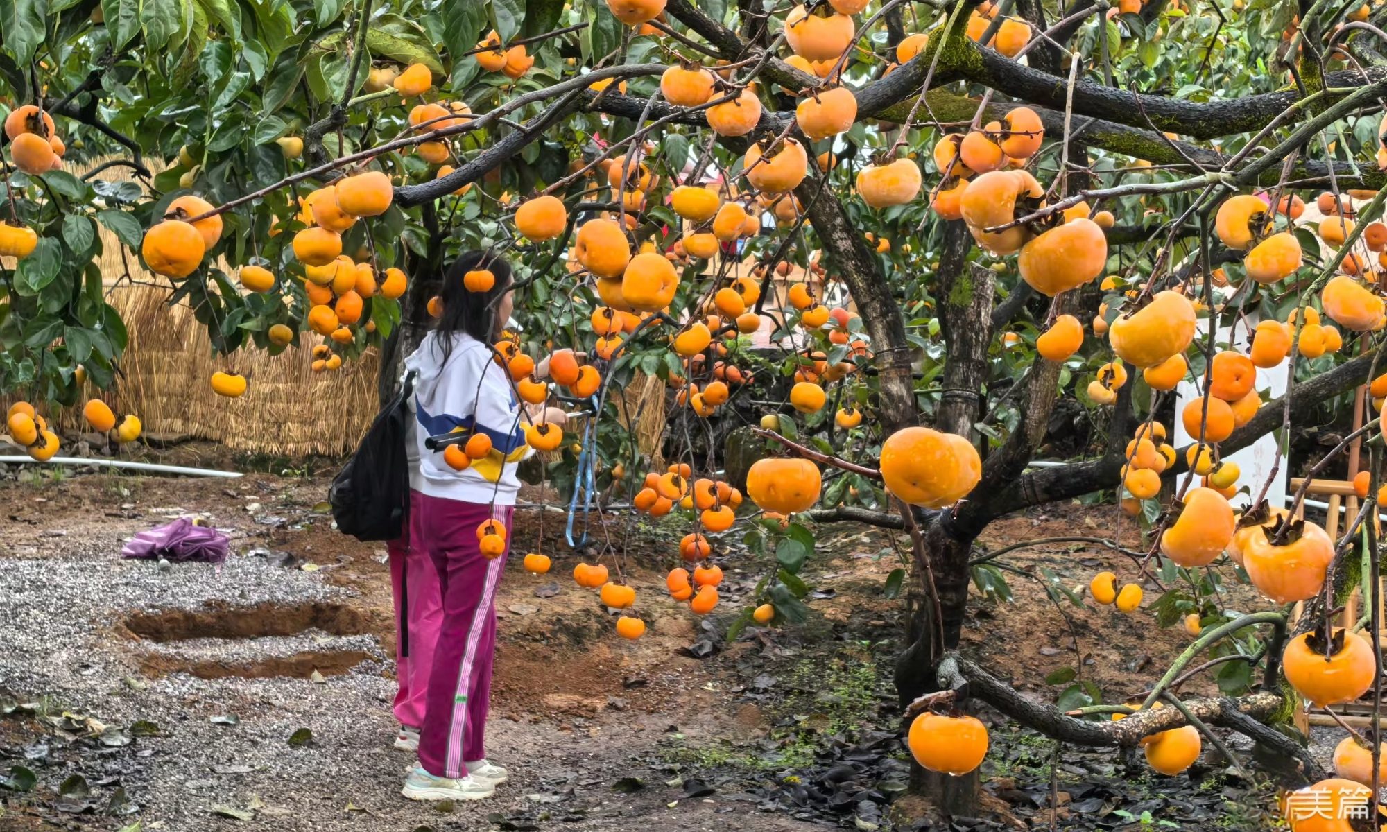 村中人家的院落里,柿树压弯了枝头,红彤彤的果实低垂如铃,随风轻晃,不仅装点了寻常烟火,也为游人添了一抹触手可及的秋意。