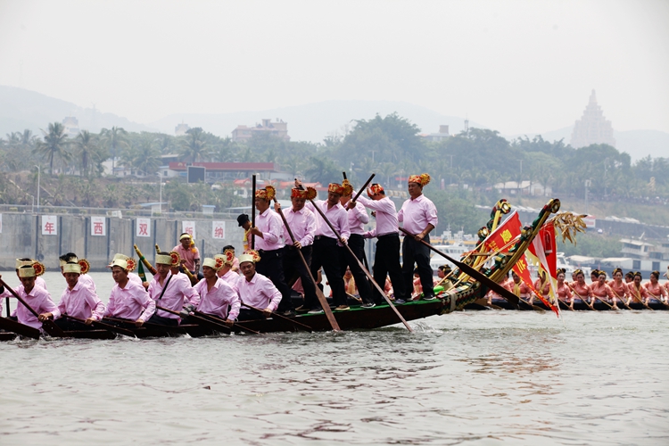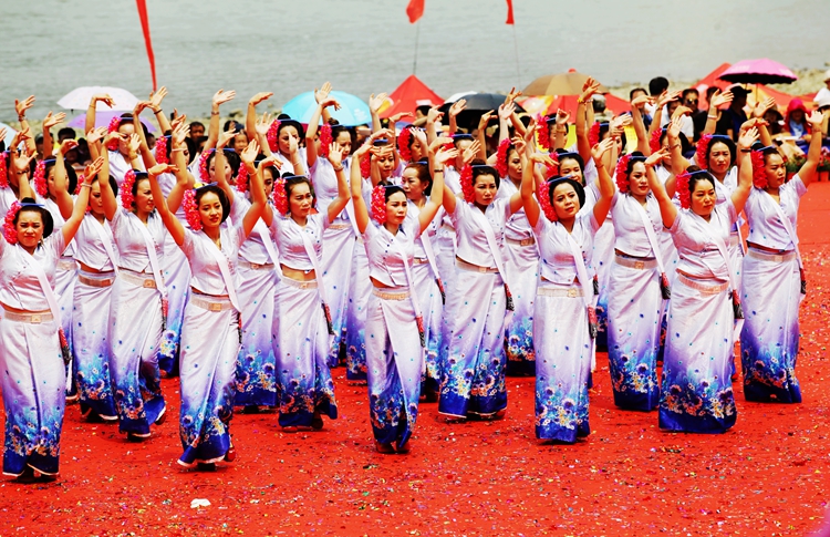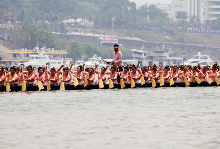 一声哨响,澜沧江水花翻腾。龙舟赛正在进行,一艘艘狭长的龙舟如离弦之箭,划手们古铜色的臂膀肌肉虬结,随着鼓手激昂的节奏奋力划桨,齐声发出的“嘿——嚯——”号子声,浑厚、雄壮,压过了江水的滔滔声,那是力与美的古老交响,是傣族汉子们对河流与生命的礼赞。还有傣家妇女也不甘示弱,她们着漂亮的傣服,奋力的划着桨,嘴里喊着“岁,岁,岁岁岁!”在这里,谁说女子不如男?