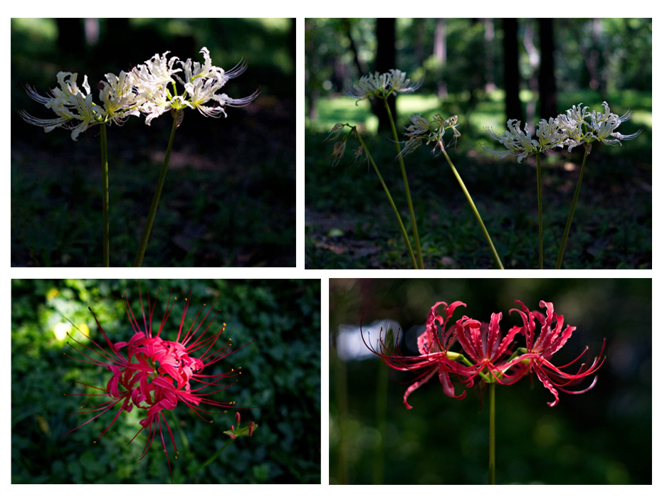 当时整个人的状态是麻木的、不知所措的,眼中的一切都是虚化的模糊状态,只是知道不认识也没见过这种花。但是陪同我的弟弟有心,上网去查。然后用惊讶的口气告诉我,这种花就是著名的“彼岸花”,怎么会这样巧?