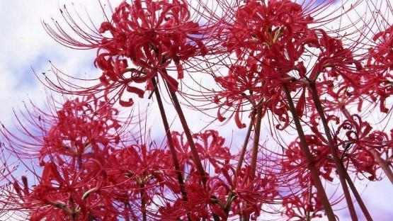 曼珠沙华则是指红色的彼岸花,大红莲花,鲜红柔软,诸天可随意降落此花,以庄严说法道场,见之者可断离其恶业。曼殊沙华象征生死两隔、无法相见,花语为“无尽的爱情、死亡的前兆、黄泉的召唤”。