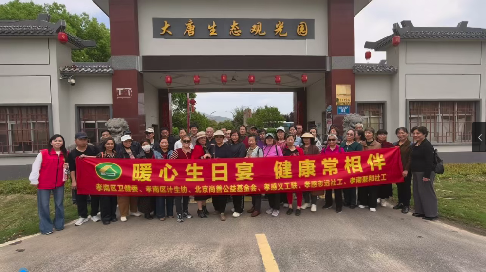 2026年4月12日,孝南计生协联合北京尚善公益基金会,孝感义工联合会在孝昌丰山大唐生态园为特殊计生家庭的老人举办了一场意义非凡的踏青集体生日宴,在工作人员及志愿者陪同下,共度了一个温馨、欢乐的春日生日会。