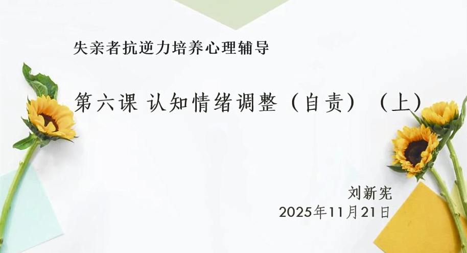 发布于2026年4月18日2026年4月18日 由mulan木兰推荐|认知情绪调整(一)(上)—失亲者抗逆力培养系列第六课 视频发布、文字说明:木兰 课程文字内容请关注《哀伤疗愈之家》公众号 讲座时间:2025年11月21日 授课老师:刘新宪主题:有针对性地调整和建立积极认知 壹 认知行为疗法简介 一、认知行为疗法回顾 贰 为什么失去亲人容易自责 一、为什么丧亲往往会引发自责? 二、导致严重自责的风险因素 三、过度自责可能产生的负面影响