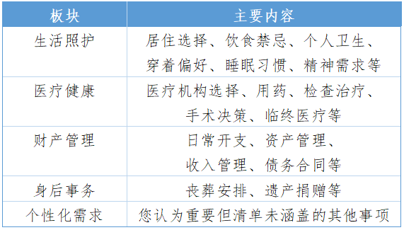 作为本套解决方案的核心服务工具,“意愿清单”旨在为市民提供一份可选、可改的参考模板,帮助系统梳理在生活照护、医疗健康、财产管理、精神需求、身后事务等方面的个人意愿。