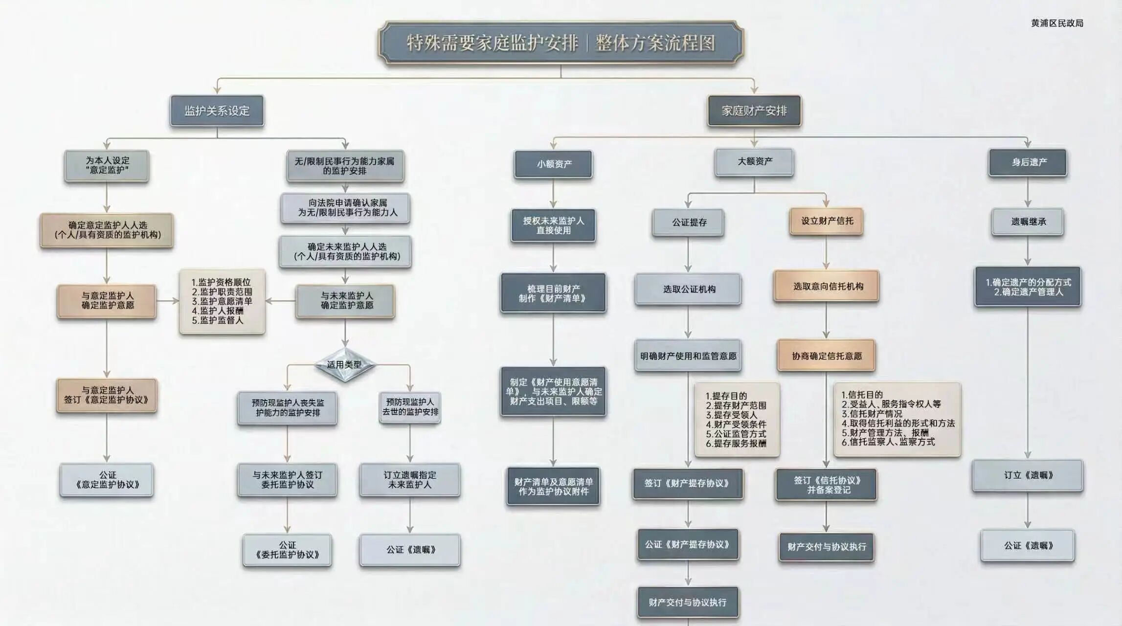 直观呈现监护设定和财产安排的全流程,帮助您根据个人意愿与需求,了解每一步该做什么、找谁办、怎么办。
