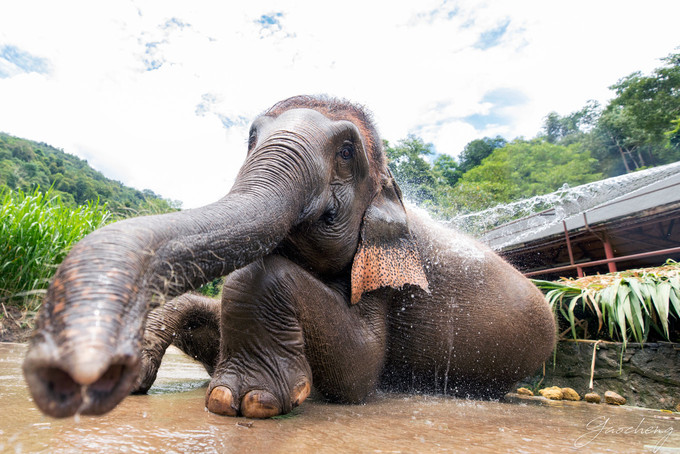 图:在野象谷为亚洲象洗澡 by 小小喷子