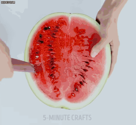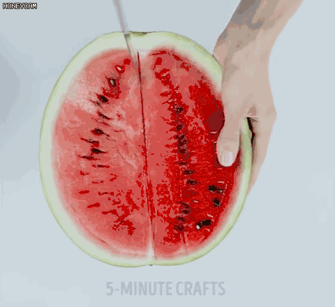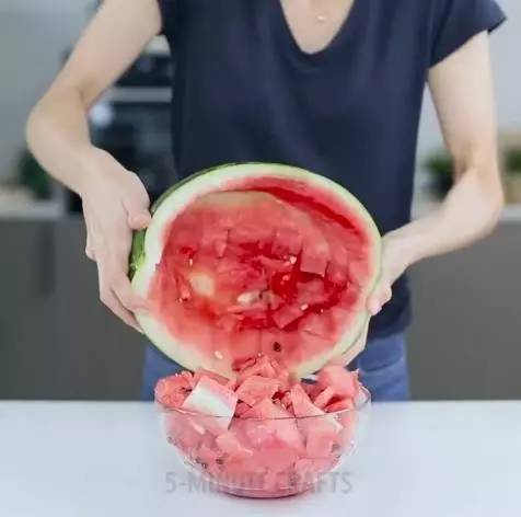 往一个大碗里一倒,西瓜都变成四四方方很方便的西瓜块!