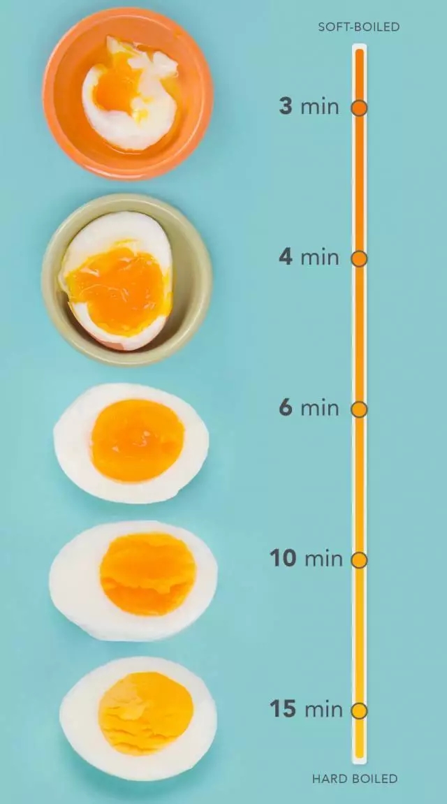 4、怎么煮溏心蛋:把水烧开,然后放入鸡蛋,开始计时~下面是煮不同时间的鸡蛋的不同状态,看看你想吃哪种,就煮哪种鸡蛋~特别准!