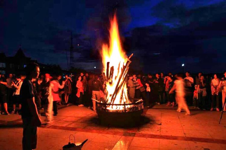 未知几许,太阳已踱到了山后,天空笼罩着半透明的胶质,繁星闪闪烁烁,月亮宛若高挑的灯笼。忽然,一声抑扬的蒙古长调划破了夜空,伴随着马头琴曲穿过苍穹回响。山包下一堆篝火腾空而起,霎时照亮了空旷的原野,也照亮了无边的草原。我随人群朝篝火奔去,火光下映出了身着长袍的蒙族牧人,那如泣如诉的马头琴曲正从他手中奔涌……