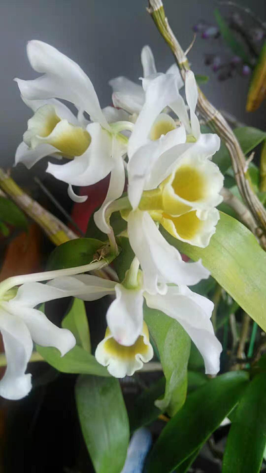 我自小喜爱花草,很多常见的花草品种也种养过,对于石斛却是陌生。与石斛的意外邂逅让我产生了一定要养护它们的念头,于是,我买了相关的书籍来学习,其中一本有砖头那么厚。我很有耐心地去研读,去了解它的品种和习性,越了解就越喜爱。花草市场成了我频繁出入的场所,花店老板也成为了花友,一盆盆的石斛被我搬回了家。我每天几乎都要花两三个小时的时间在它们身上,根据天色和气温的变化,早上抬出去,晚上收回来,浇水施肥,修枝剪叶,精心呵护。从最开始的金钗石斛、玫瑰石斛、铁皮石斛、报春石斛等等,到后来更多稀有的品种;从最开始的五六盆,到后来的五六十盆,最多时已近百盆。我家已经有一半的石斛花品种,客厅和几个阳台,包括墙壁,已经几乎被石斛花占领了。我还加入了一个石斛花的花友群,和大家一起讨论、学习、分享。